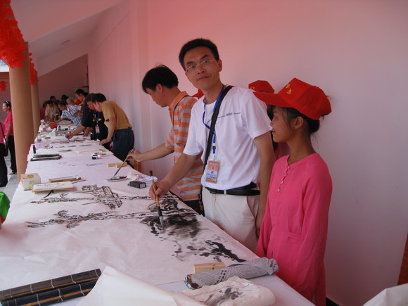 “蓝色畅想”百位各族各界书画名家同绘防城港艺术峰会近日在中国京族唯一的聚居地万尾金滩开幕。来自全国各地的书画名家在对该市进行文化采风活动之后,通过书法、绘画形式浓墨重彩描绘防城港市的美丽风光、人文历史、发展变迁,共同创作完成百米画卷,为迎接新中国成立60周年献礼。