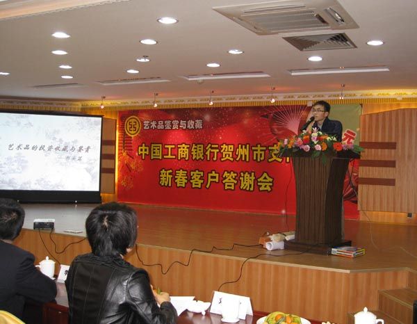 工商银行广西分行贺州市支行于2011年1月12日下午在贺州国际大酒店举办以书画鉴赏为主要内容的诸多活动,邀请了120名高端客户参与活动。为广大颇具收藏爱好的高端客户搭建共同品味、共同欣赏、博览古今精品的信息平台,积极营造典雅、高贵、文化、艺术的浓厚氛围